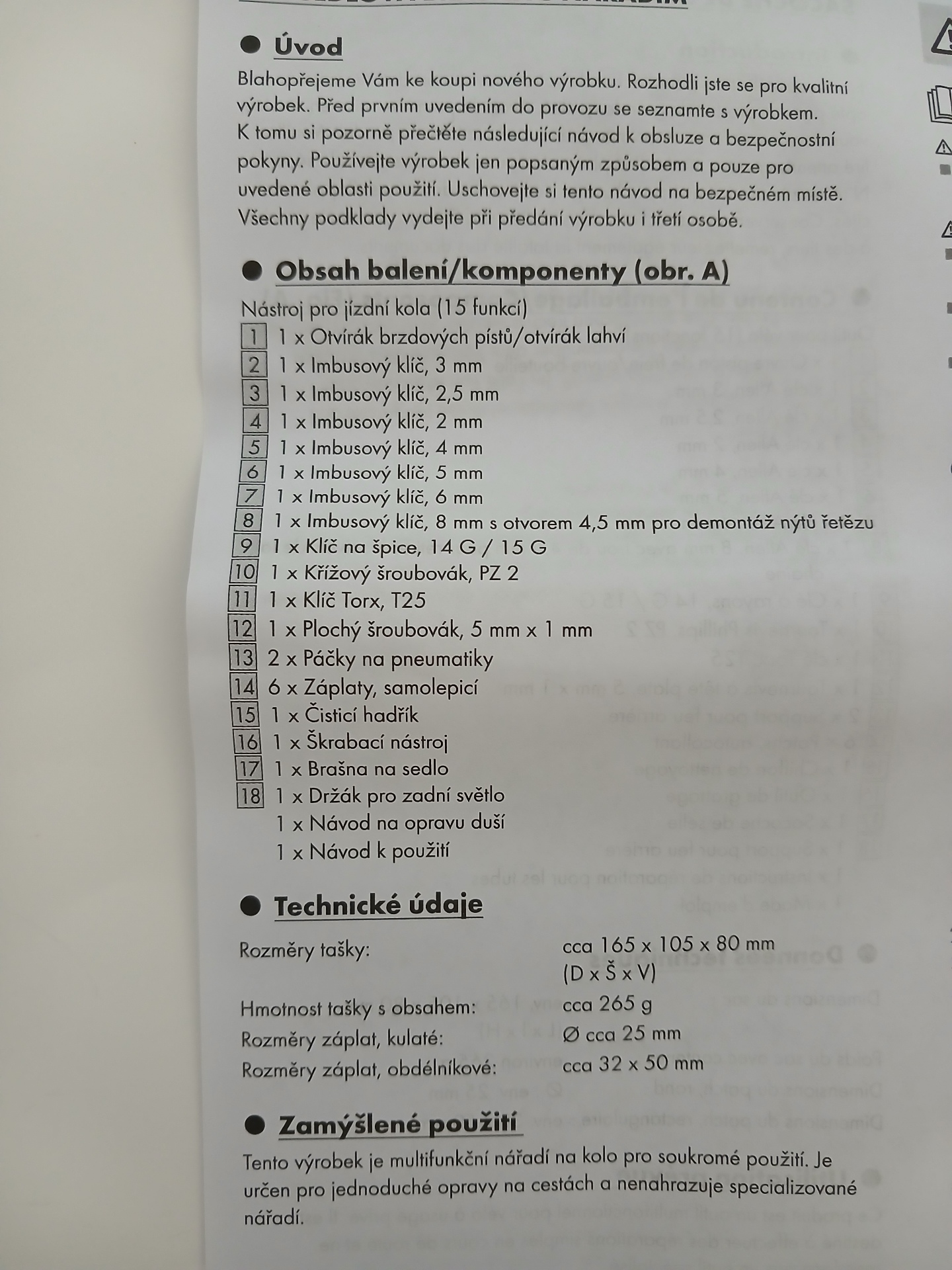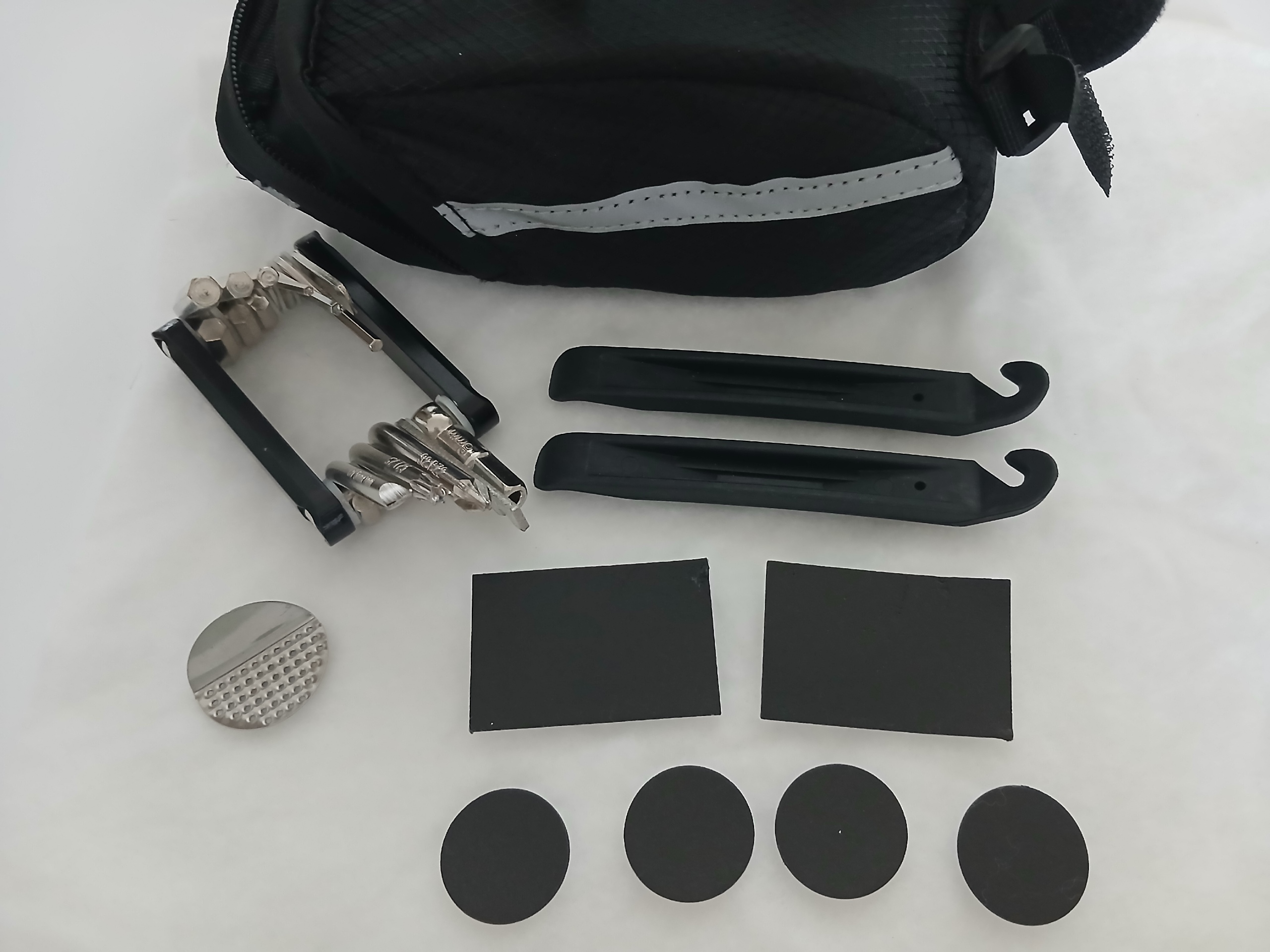 Obsah je detailně popsán na fotce, obsahuje imbusové klíče, šroubovák, páky na výměnu pneumatik, záplaty, atd.