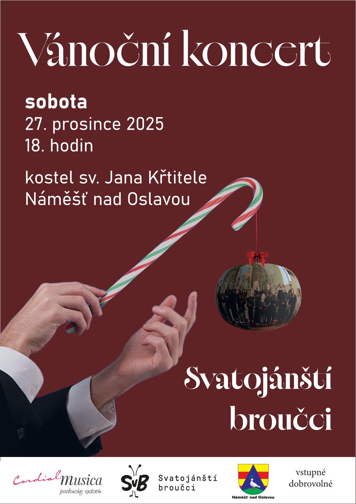 Zveme Vás na vánoční koncert Svatojánských broučků! Přijďte se potěšit vánočními melodiemi a sdílet tento radostný čas s námi! Datum: Sobota 27. prosince Čas: 18:00 h Místo: Kostel sv. Jana Křtitele, Náměšť nad Oslavou