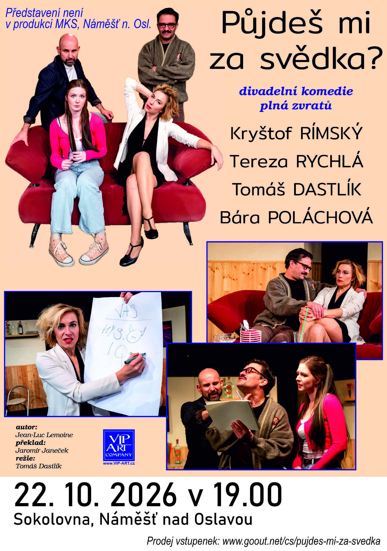 Jean-Luc Lemoine Půjdeš mi za svědka? Výprava: MAJADA Art, Šicí centrum Jehla Pelhřimov. Překlad a režie: Jaromír Janeček. Tereza Rychlá (původně Daniela Šinkorová), Tomáš Dastlík (původně Karel Zima), Jarmil Škvrna / Kryštof Rímský, Jana Rybníčková (Yanna) / Barbora Poláchová