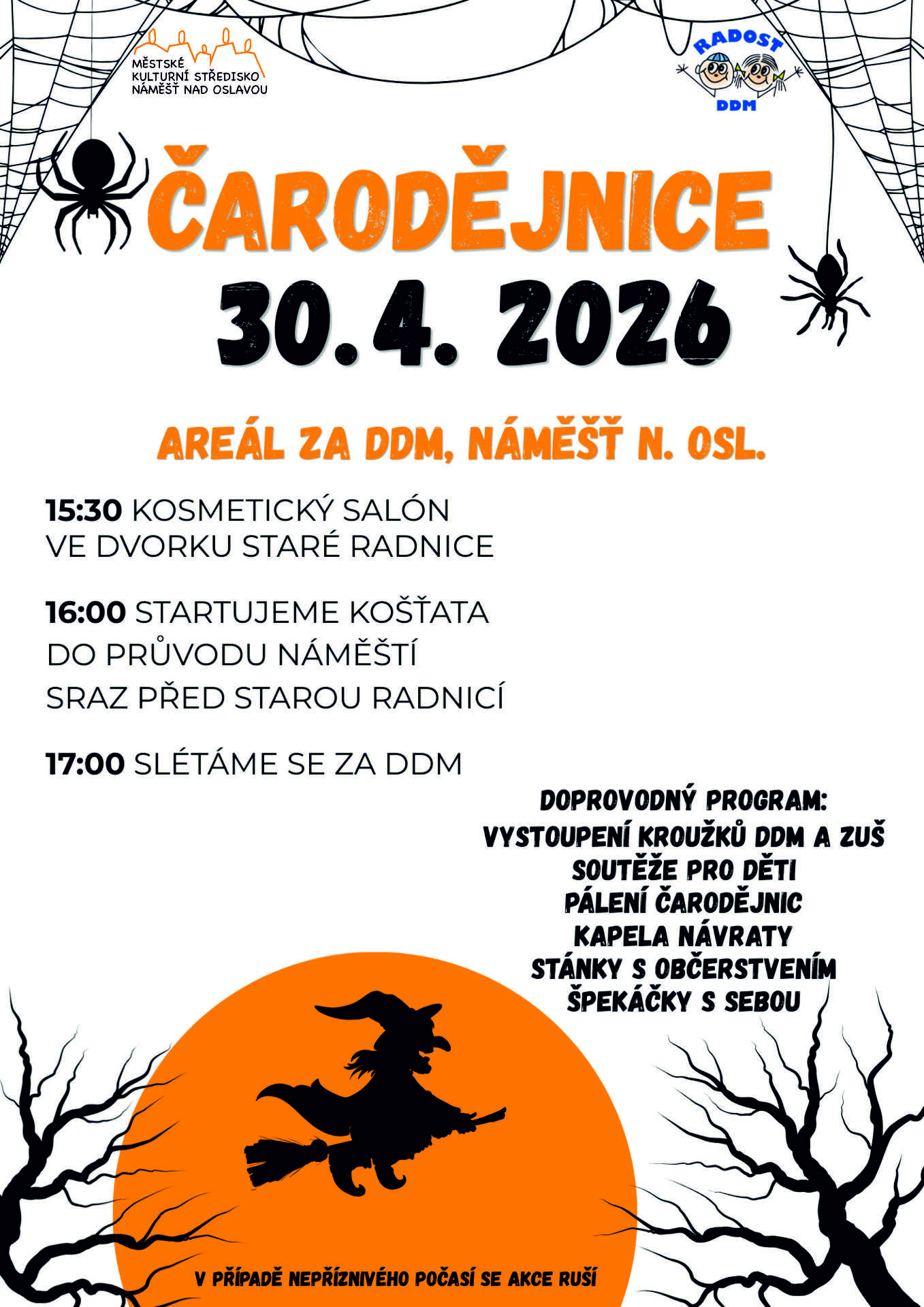 Bohatý program pro děti. Od 16 hodin budeme startovat košťata a přidáme se do průvodu. Sraz bude před Starou radnicí, kde si od 15:30 můžete nechat namalovat něco na obličej a jiné části těla Od 17:00 se slétáme za DDM.