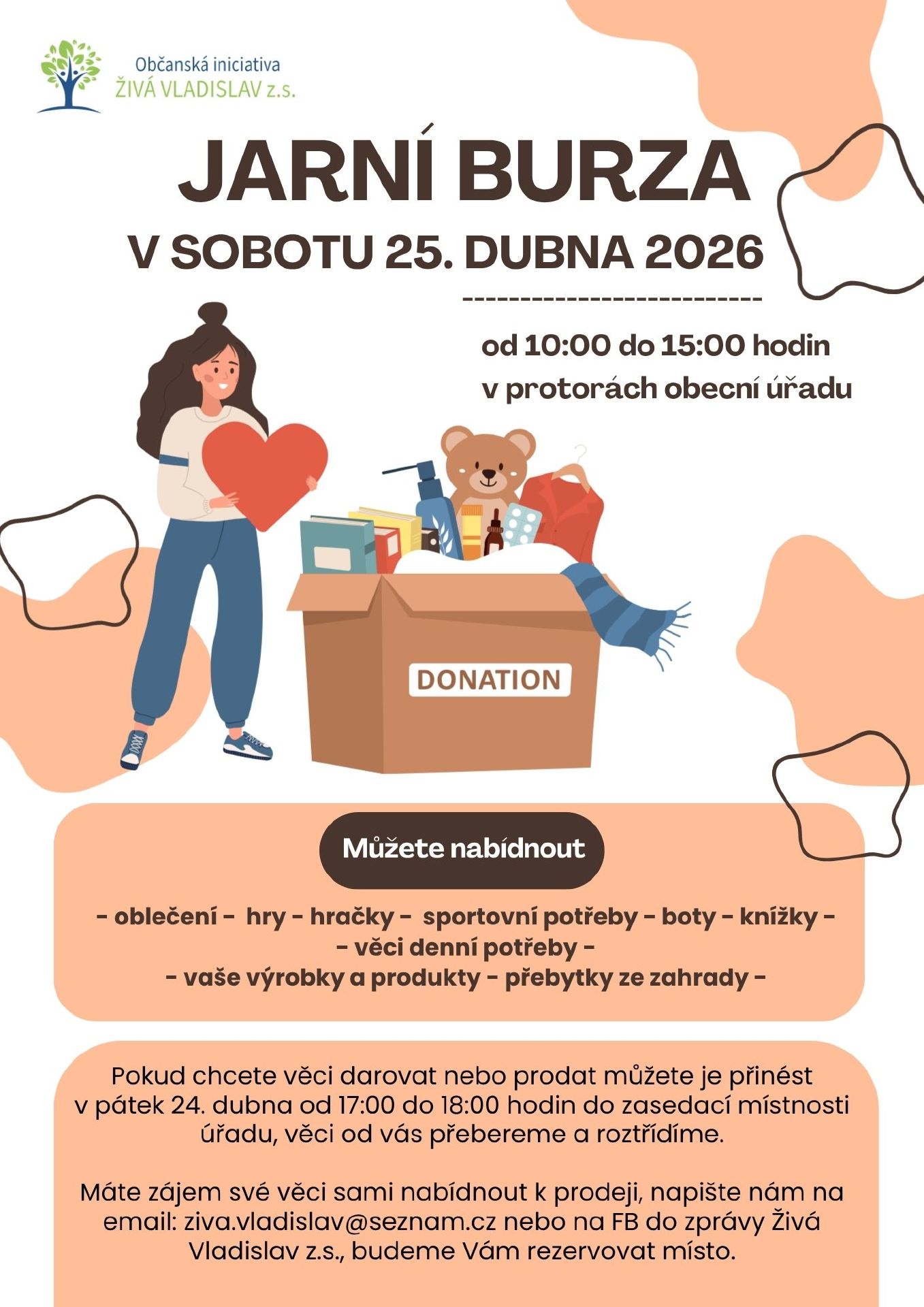 Můžete nabídnout - oblečení - hry - hračky - sportovní potřeby - boty - knížky - věci denní potřeby - vaše výrobky a produkty - přebytky ze zahrady - atd. -------------------------- Pokud chcete věci darovat nebo prodat můžete je přinést v pátek 24. dubna od 17:00 do 18:00 hodin do zasedací místnosti úřadu, věci od vás přebereme a roztřídíme. Máte zájem své věci sami nabídnout k prodeji, napište nám na e-mail: ziva.vladislav@seznam.cz nebo na FB do zprávy ŽiváVladislav z.s., budeme Vám rezervovat místo.