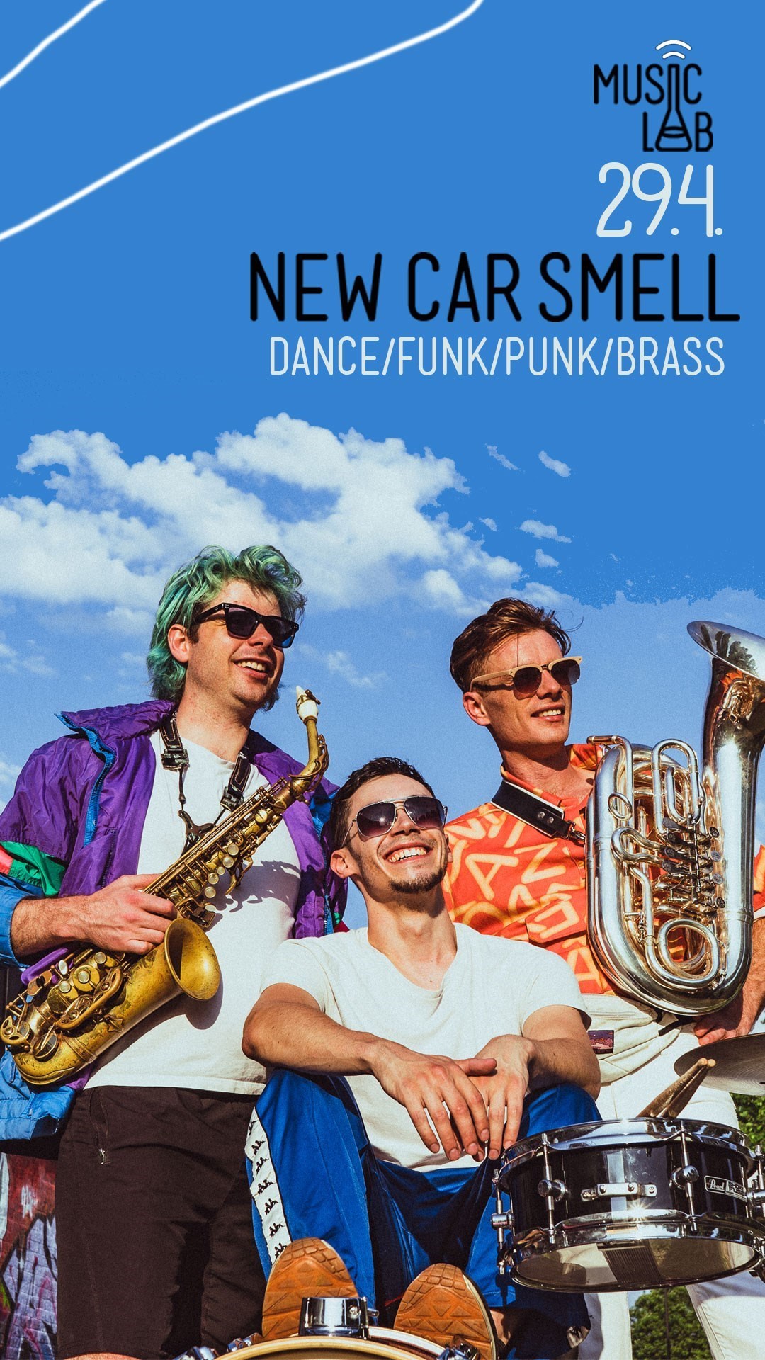 Punkové trio převlečené za dechovou kapelu – NEW CAR SMELL je tříčlenná rave mašinérie. Se saxofonem, tubou a bicími využívají sílu svých plic ke kombinaci dance, punku a funku, aby rozpohybovali celý klub!
