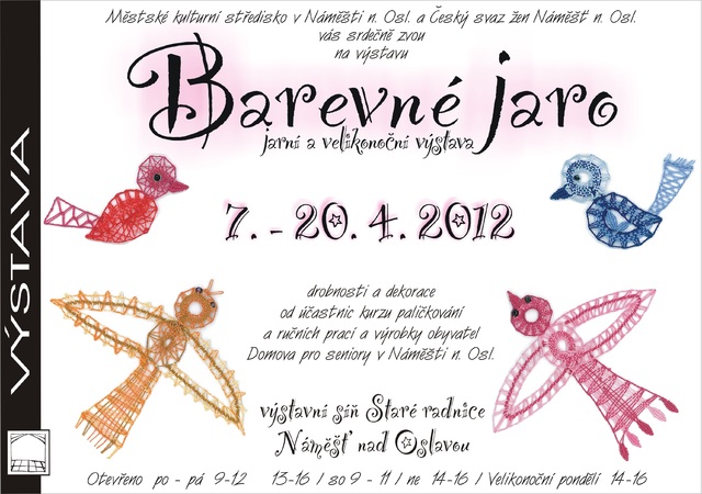 Výstavu s názvem Barevné jaro připravilo Městské kulturní středisko v Náměšti nad Oslavou ve spolupráci s Českým svazem žen v Náměšti. Přijďte se tedy podívat od 7. do 20. dubna do výstavní síně ve Staré radnici na drobnosti a dekorace od účastnic kurzu paličkování a na výrobky obyvatel z náměšťského Domova pro seniory.